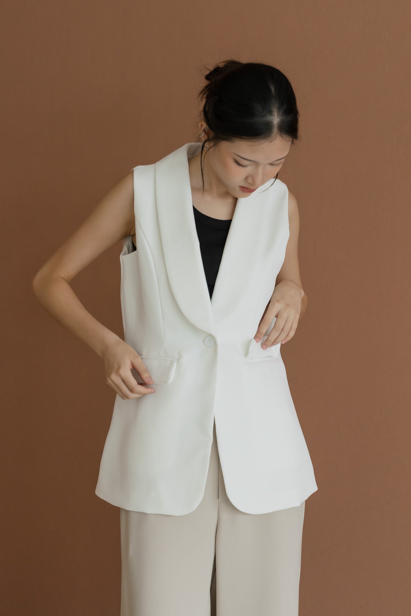 Material: PolyesterLining: Fully linedOpening: Front buttonPockets: Functional pockets on the frontColours: BLACK and WHITEMeasurements (in inches)Model is 168cm, UK 4-6 and wears size S