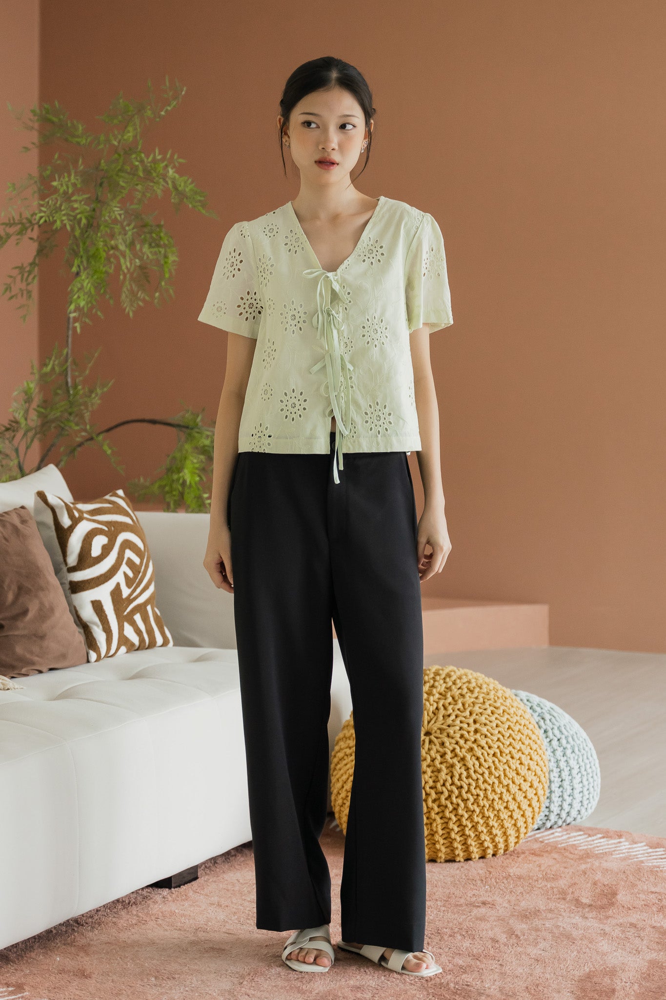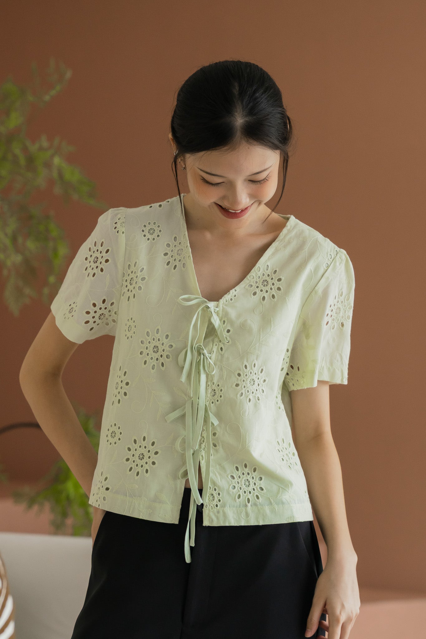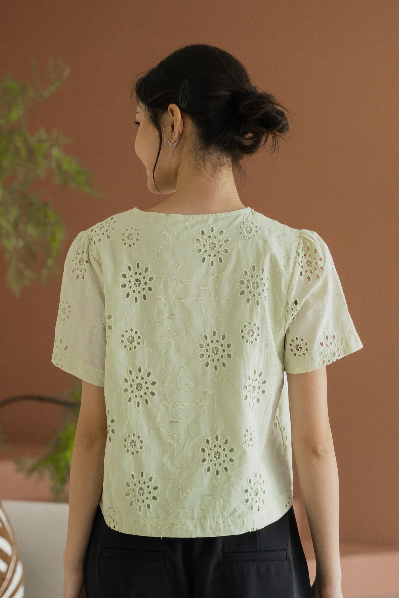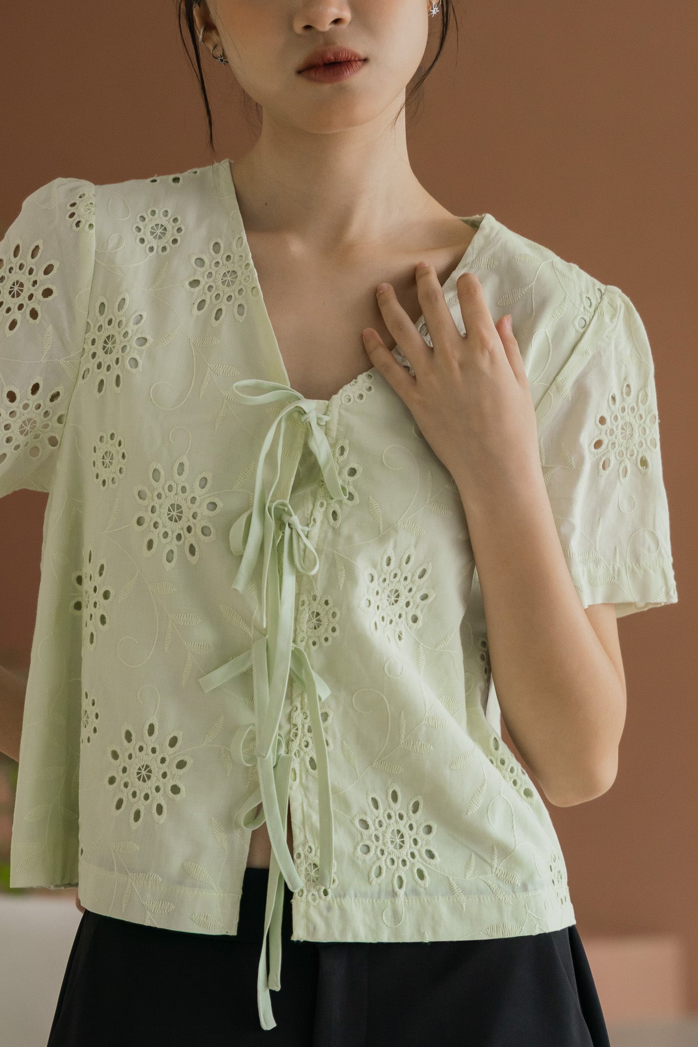 Della Sleeved Eyelet Blouse in Light Green