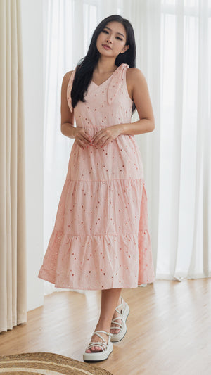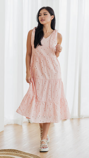 Jemma Broderie Tiered Midi Dress in Pink [ONLINE ONLY]
