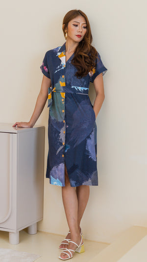 Life On A Canvas Linen Camp Collar Dress in Navy