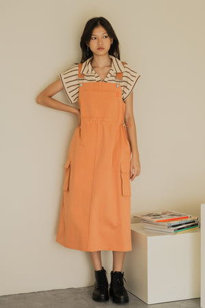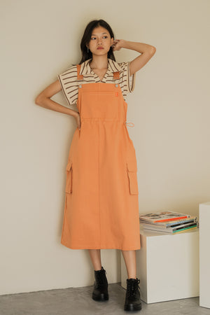 Material: Cotton TwillLining: Not lined and not sheerPockets: Concealed and cargo pockets on the sidesOpening: Slip on with detachable shoulder strapsOther features: Adjustable waist bandColours: CREAM and ORANGEMeasurements (in inches)Model is 168cm, UK 4-6 and wears size S